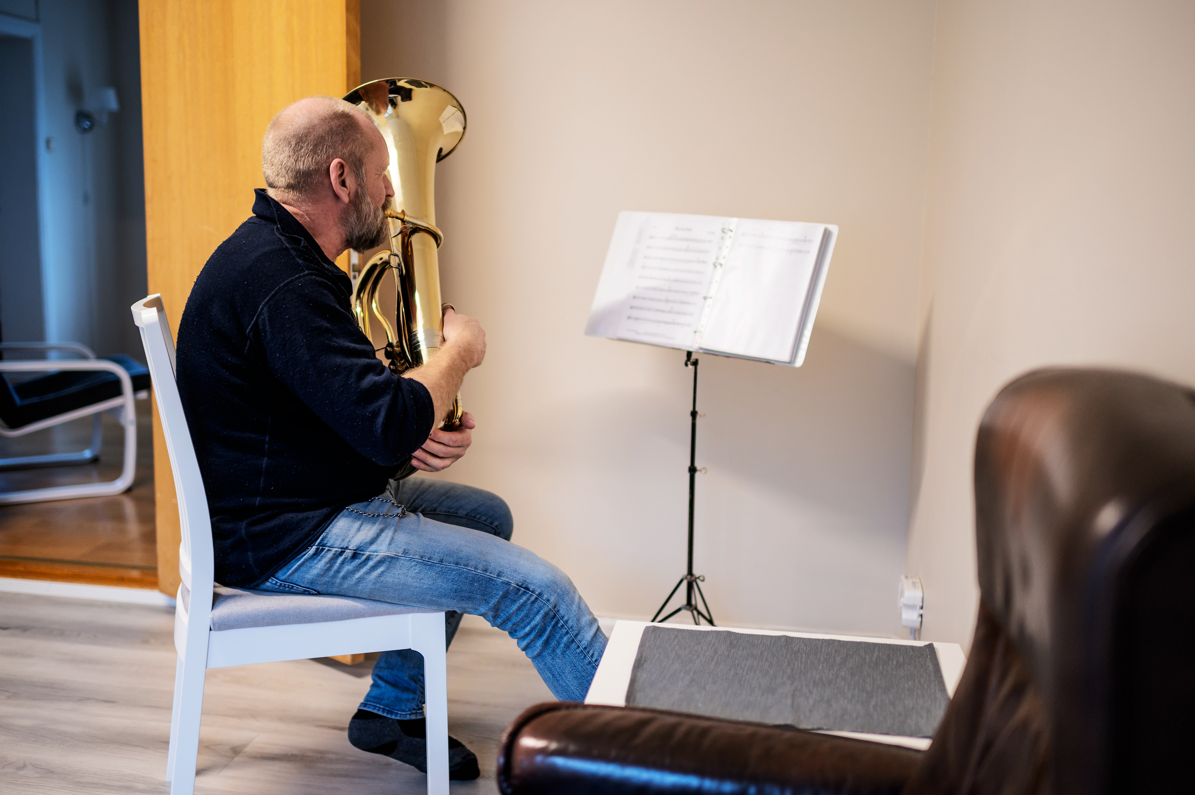 Kjell Olsen har drevet med korps siden 1970. I et hjørne av spisestua øver han på sin eufonium.