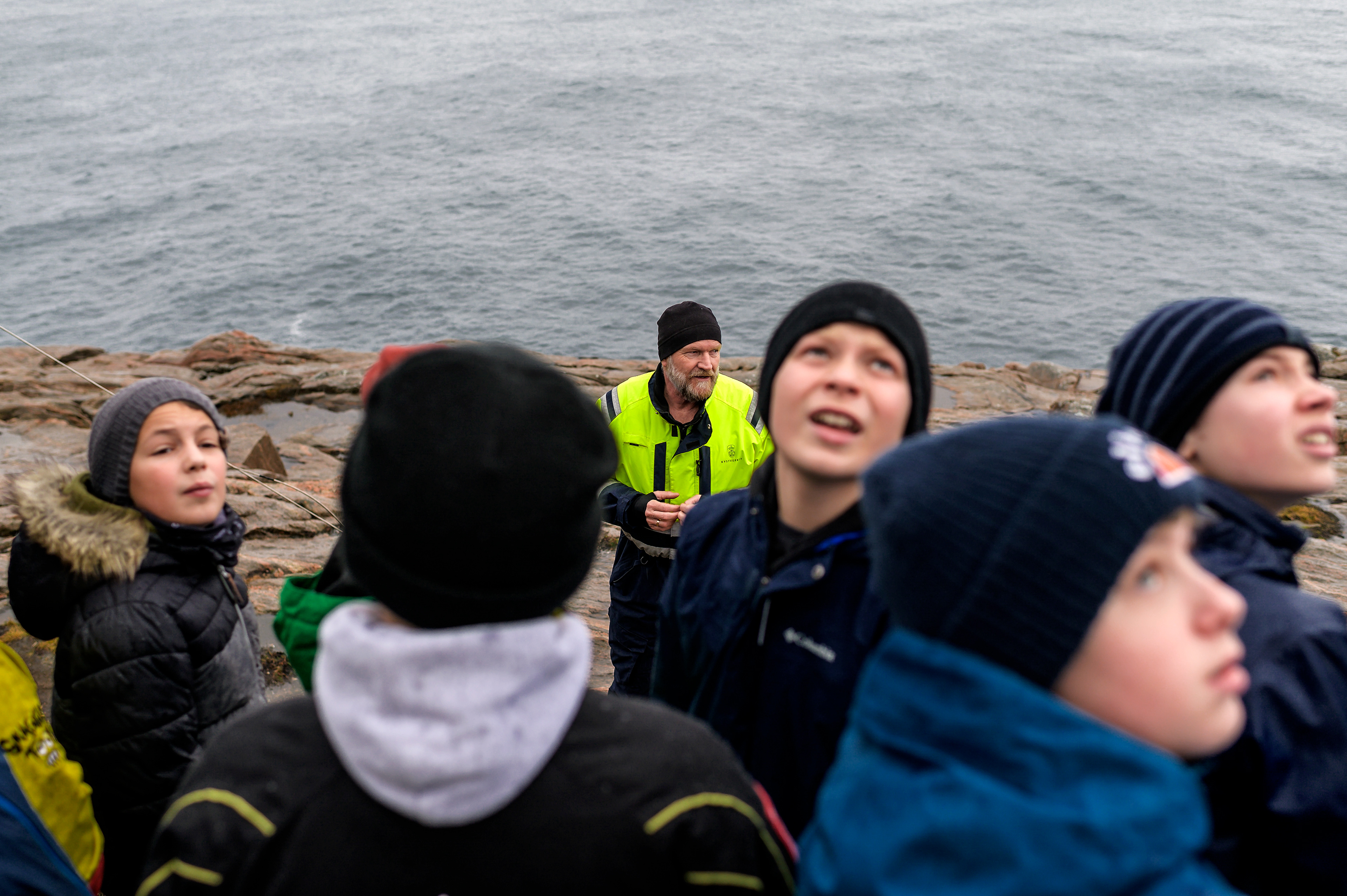 Sjuendeklassingene fra Hånes skole snur seg for å ta fyrtårnet nærmere i øyesyn idet fyrvokter Kjell Olsen forteller historien bak det 105 år gamle støpejernstårnet.