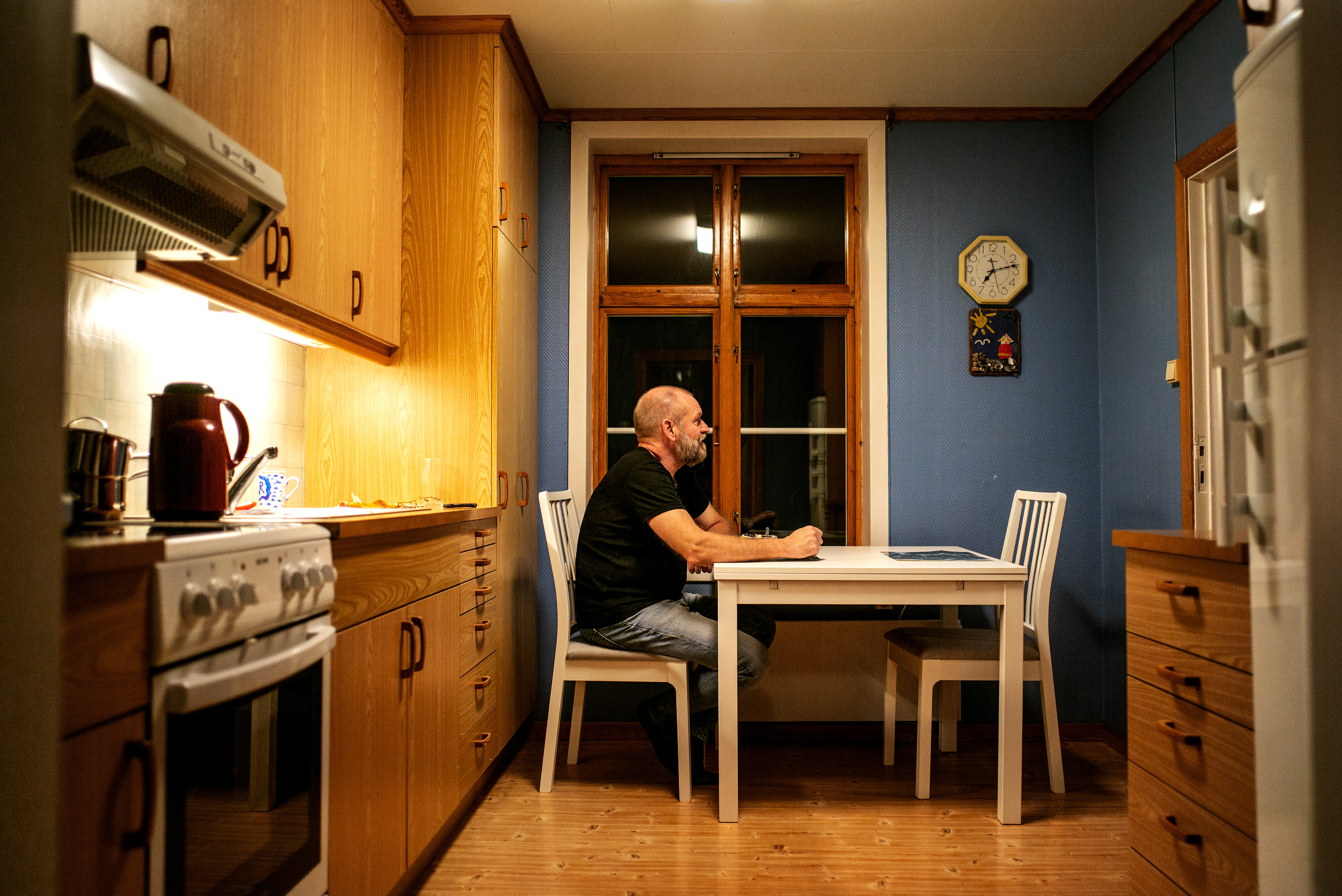 Klokka er 07.15 og frokosten inntas på kjøkkenbordet i fyrvokterboligen.